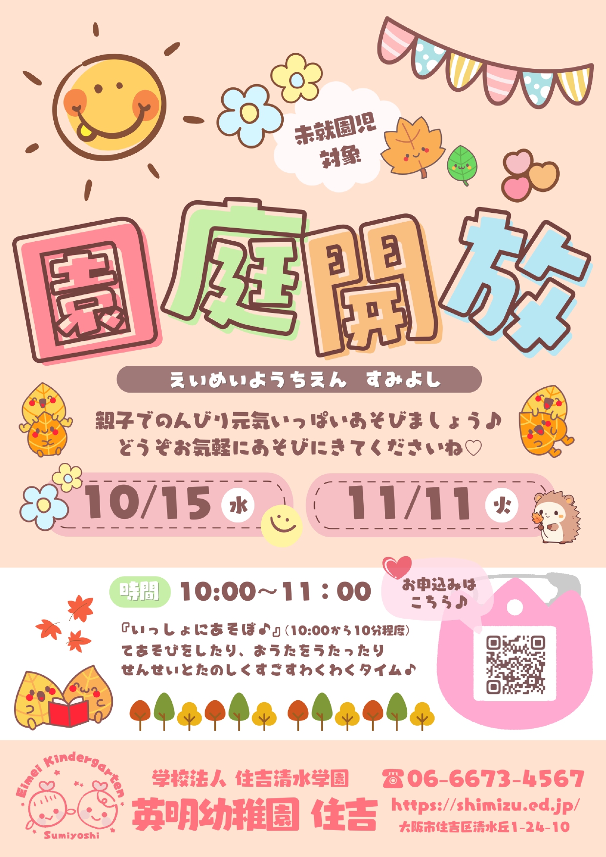 英明幼稚園住吉では、2025年10月15日(水)・11月11日(火)に未就園児を対象とした園庭開放を開催いたします。