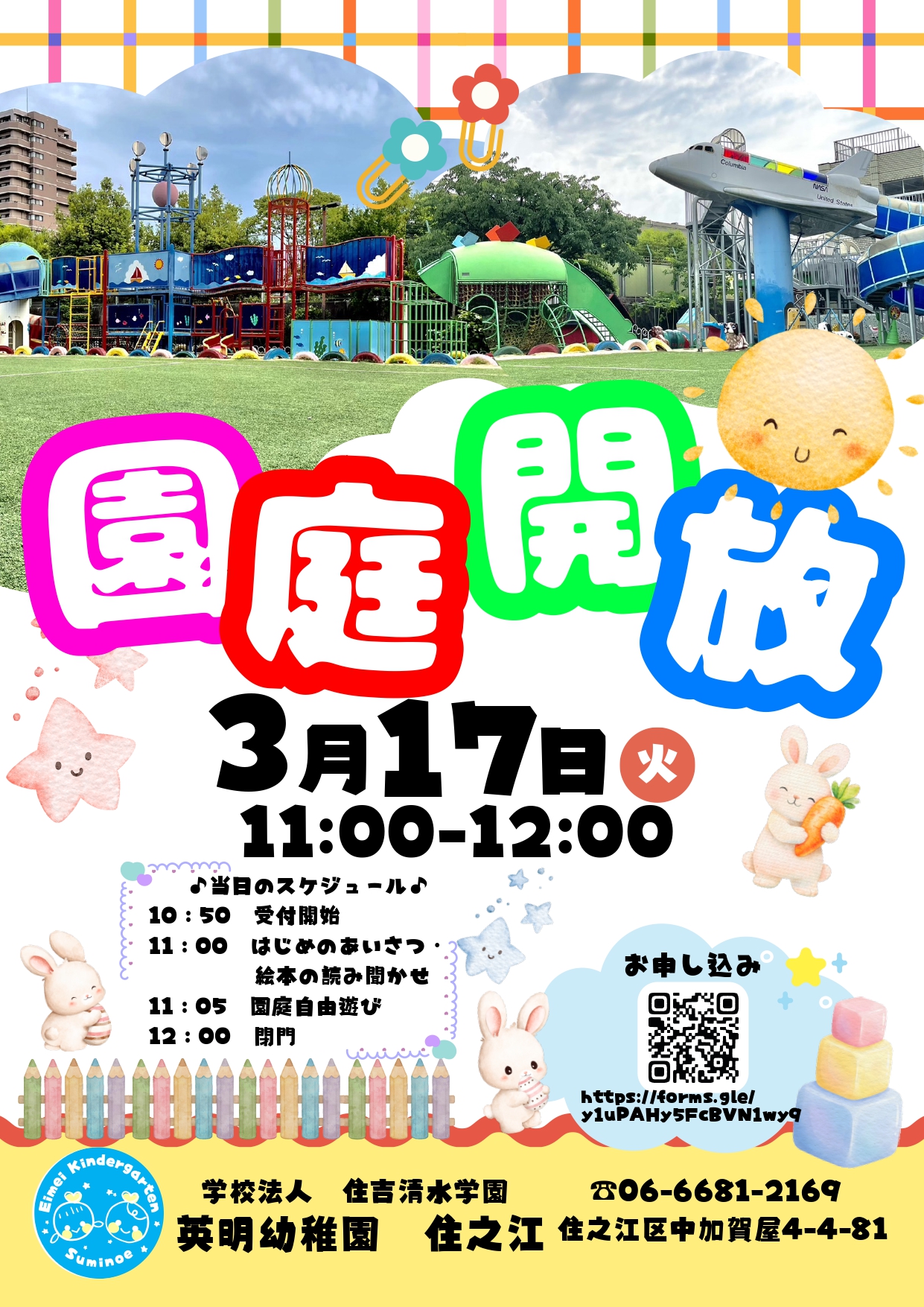 英明幼稚園住之江では、3月17日(火) に未就園児を対象とした園庭開放を開催いたします。