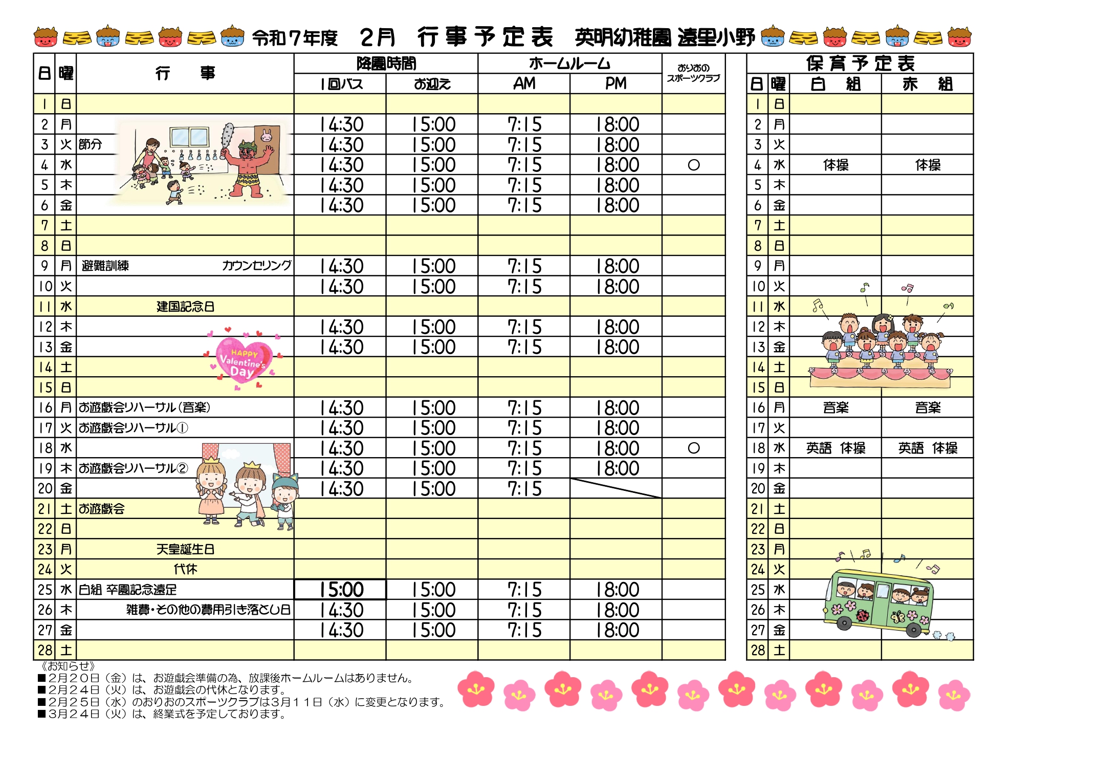 英明幼稚園遠里小野の『行事予定表』2026年2月号です。