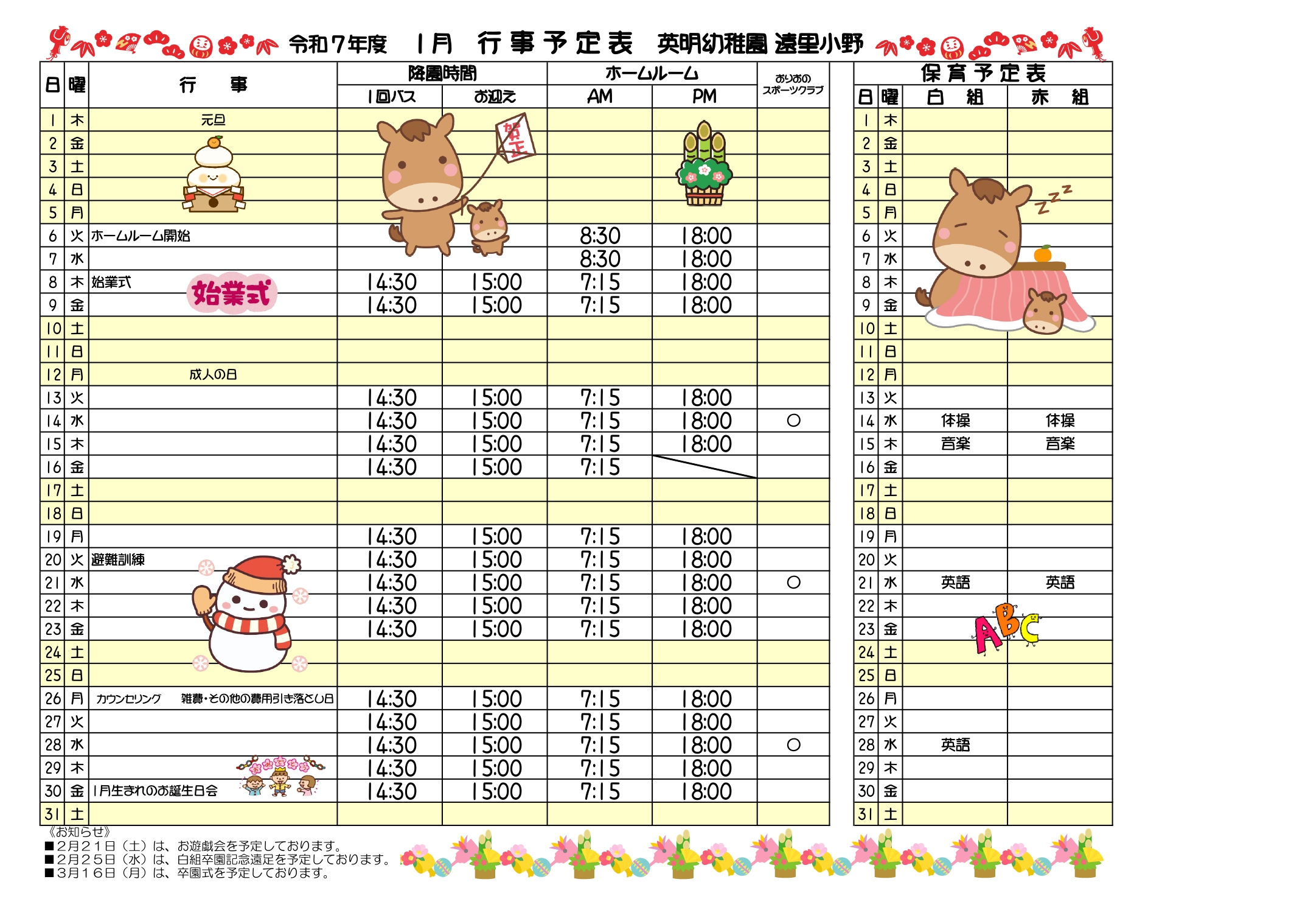 英明幼稚園遠里小野の『行事予定表』2026年1月号です。