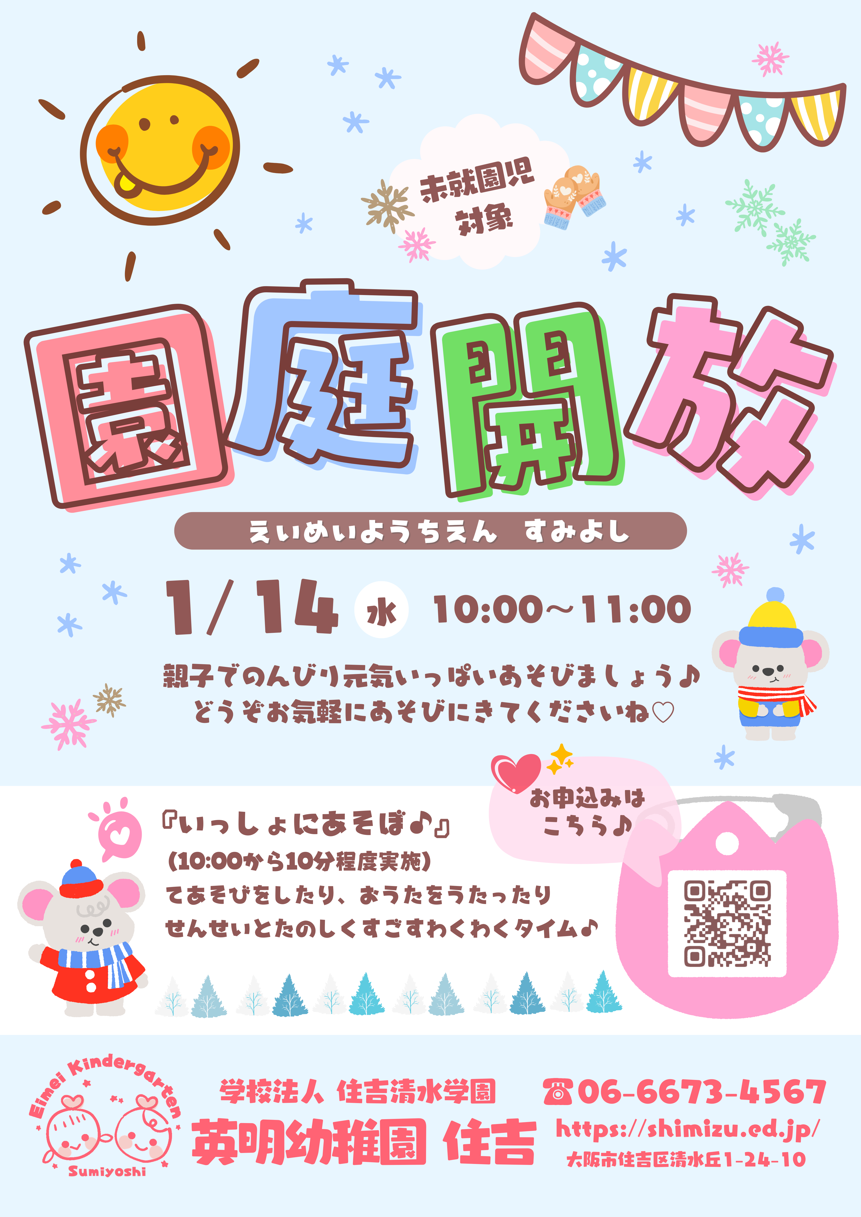 英明幼稚園住吉では、2026年1月14日(水)に未就園児を対象とした園庭開放を開催いたします。